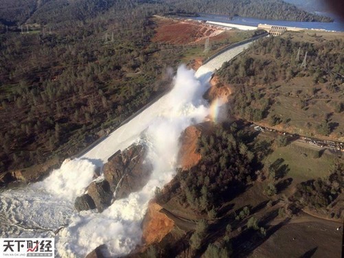 美国最高水坝、加州北部的Oroville坝的泄洪道因山体塌陷遭到损毁,加上近期连续大雨,引发可能决堤爆发洪水的担心,至少18.8万人被紧急疏散。图为泄洪道在泄洪,洪道中段和下段均出现垮塌。