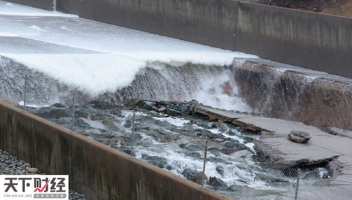 美国最高水坝、加州北部的Oroville坝的泄洪道因山体塌陷遭到损毁,加上近期连续大雨,引发可能决堤爆发洪水的担心,至少18.8万人被紧急疏散。图为2月7日泄洪道的坍塌已很严重。