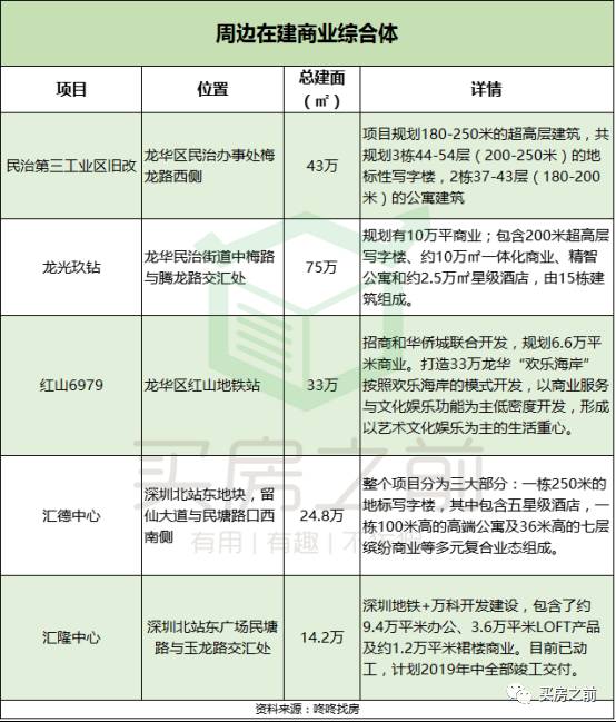 目前同类公寓产品有汇隆中心(已售罄)和龙光玖钻(即将开盘),汇隆中心此前开盘均价在6.5万/平左右,而龙光玖钻走的是高端路线,销售称售价肯定比周边高,将作为龙华价格标杆。那么未来这个项目会售价多少,或许可参考一二。