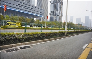 进行更新的护栏将统一样式和颜色。样式参照深南中路的标准,人行道侧护栏采用2016式路侧护栏,中间隔离栏采用2016式路中护栏,颜色统一采用浅灰色。道路两侧隔离护栏往人行道内移,设置在人行道与外侧绿化带之间。绿化带中隔离网色彩统一规范为黑色,现有非黑色隔离网应重新刷漆成黑色。