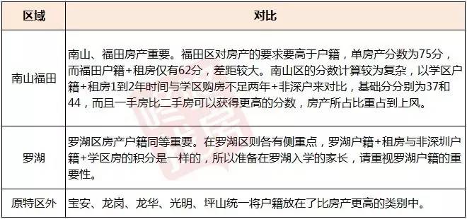 深圳在2013年起试行义务教育阶段积分入学政策,各区总体来说大同小异,所需条件无非户籍、房产、租赁合同、社保等等,其中户籍和房产是比较重要的条件,各区都将户籍+房产放在了第一类别,在户籍方面,福田和南山要求学生落户在房产内才可以获得最高分数,而其他区则仅需要本区户籍即可,非本区深户在得分上有所降低,所以提醒各位家长尽早将孩子户籍迁入房产内较为稳妥。