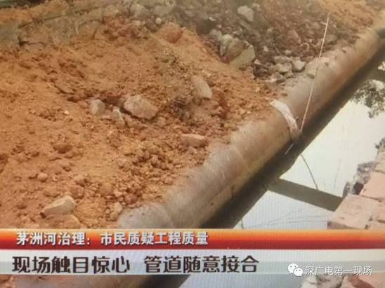 事实到底如何,记者随后按照爆料人提供的位置,找到了位于宝安松岗的一处河道,一走近浓浓的臭味扑鼻而来,河道旁边堆着厚厚的污泥,河道里的水是黑色的,爆料人所拍摄的管道就在河道里,有一半已经被盖上土,在管道上确实绑着白色布条,还有一处没有焊接好的接缝处正往外流着污水,管道这样的状态,怎么能直接用土覆盖呢?难道真的像爆料人所说的,这个工程存在质量问题?随后记者也向附近的工人询问,工人的回答也证实了这样的情况一直存在。
