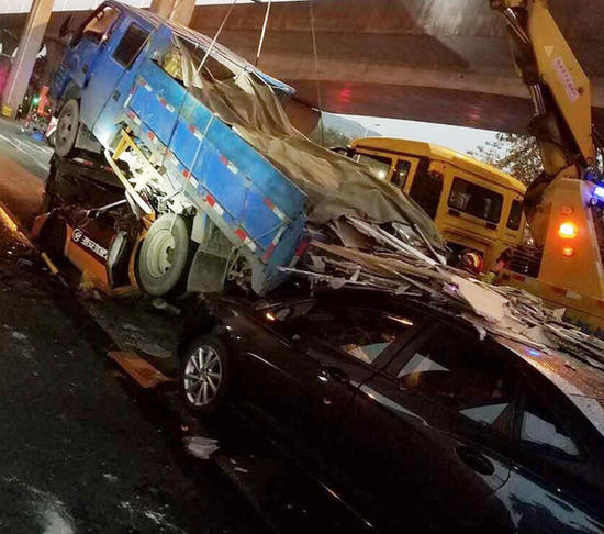 从另外一张图上可以看到,该教练车被一辆货车“骑”在身上,后面还有一辆黑色轿车追尾。