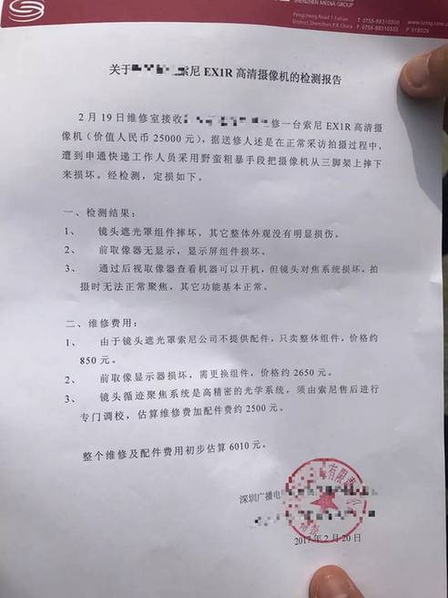 3:镜头循迹聚焦系统是高精密的光学系统,须由索尼售后进行专门调校,估算维修费用加配件费约2500元。