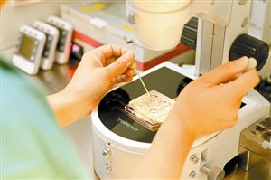 在深圳武警医院生殖中心实验室,胚胎学家吴迪在显微镜下操作单精注射,将来自父亲的精子注入到来自母亲的卵子中,从而产生受精卵。
