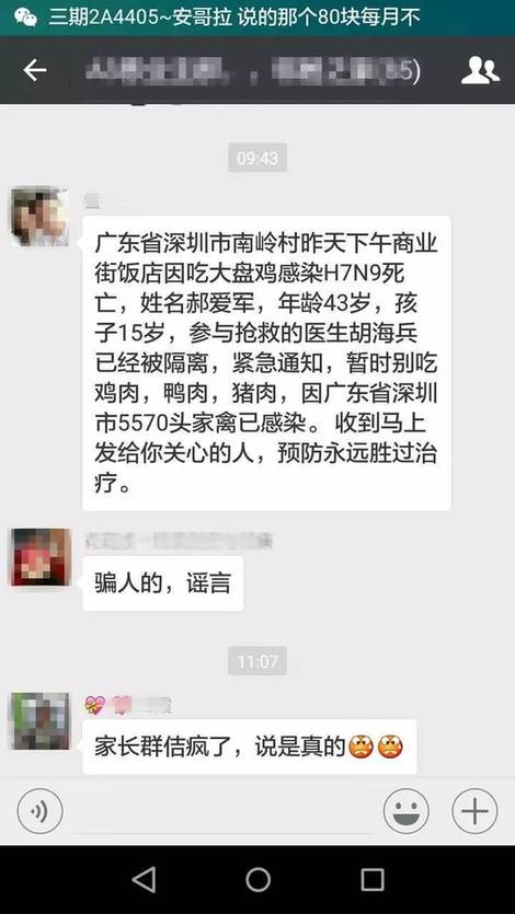 近日,一条“广东省深圳市南岭村一男子昨天下午商业街饭店因吃大盘鸡感染H7N9死亡,姓名郝爱军,年龄43岁,孩子15岁,参与抢救的医生胡海兵已经被隔离,紧急通知,暂时别吃鸡肉,鸭肉,猪肉,因广东省深圳市5570头家禽已感染。收到马上发给你关心的人,预防永远胜过治疗。看到,群发扩散,此消息属实。”的谣言满天飞,在各大微信群、朋友圈内疯传,造成不少市民群众恐慌,严重扰乱了公共秩序。