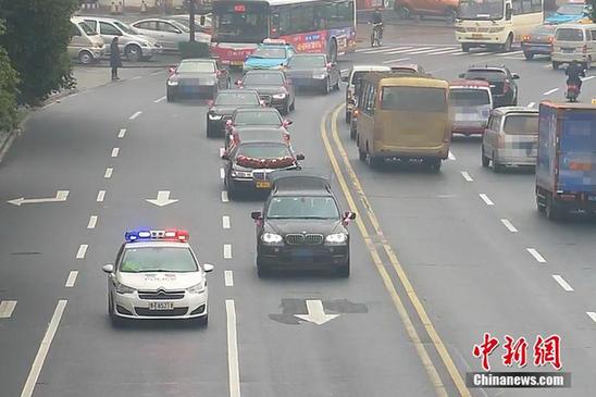 2月22日,湖北宜昌一位新郎在迎亲时,迎亲车队的头车因涉嫌套牌被交警查获。在新郎家属和交警沟通后,当地交警人性化执法,先“开道护送”,迎亲结束后才扣下套牌车。图为警车“护送”新人完成仪式。