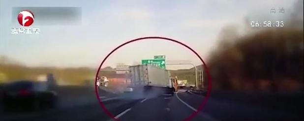 货车司机突然意识到前方的方向牌会与自己车辆发生碰撞,立即急转弯。