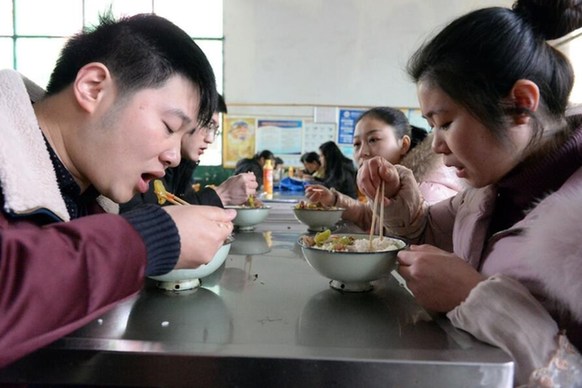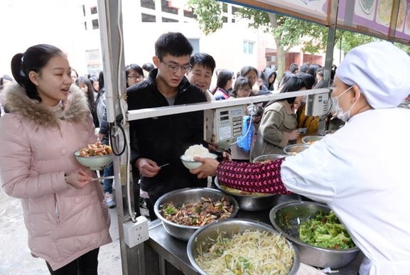 在学校食堂准备吃饭的两对“学生夫妻”。