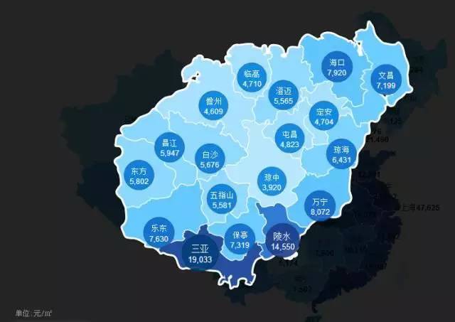 三亚最高19000元/平方米,陵水1400元/平方米,其他城市在3000-8000元/平方米之间。