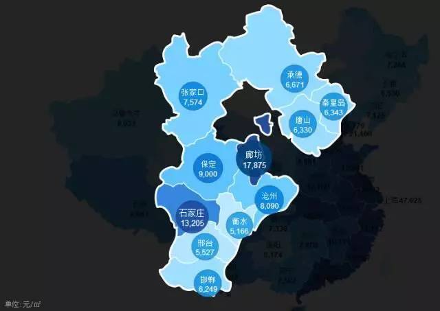 把北京去掉之后,整体房价仍不低,廊坊达到了17000元/平方米,石家庄也有13000元/平方米了,其他城市最低的是5500元/平方米,均价在7000元/平方米左右。