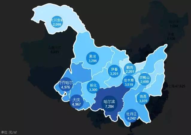哈尔滨7200元/平,其他城市均价3600元/平方米左右。大兴安岭更是只有2000元/平方米,太感人了。