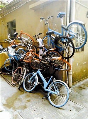 茶光村偶尔出现数辆共享单车“叠罗汉”。受访者供图