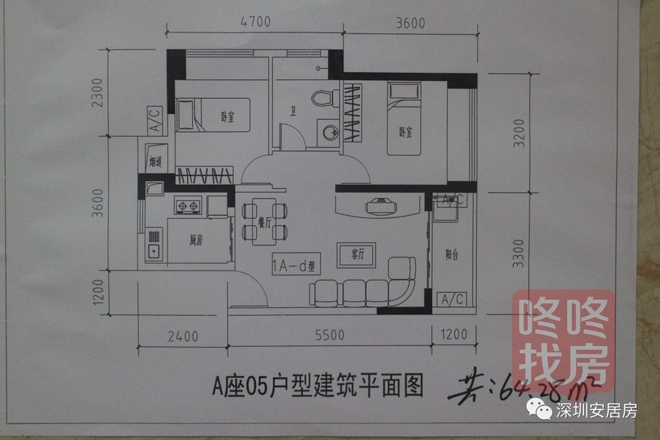 A座05户型 建筑面积64.28㎡ 两房一厅一卫