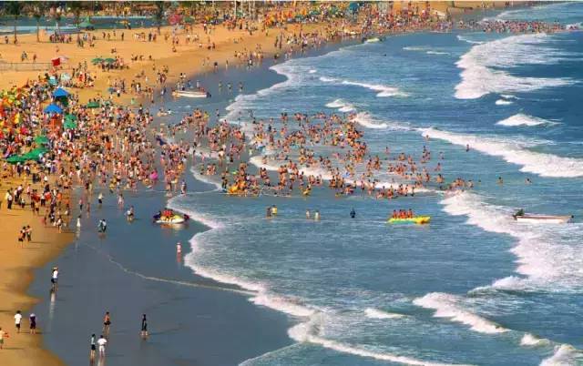 角湾弄潮。海浪一波波拍案,暖春来此游玩的人们布满沙滩。