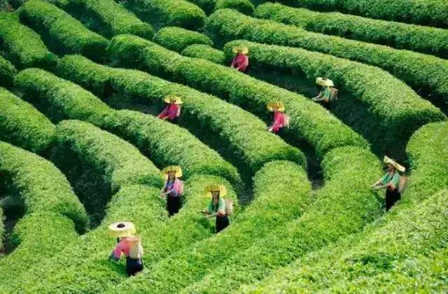置身满目翠绿的茶田,你很难不感叹大自然的鬼斧神工。梯田层级盘绕,采茶的人们中间不时传出欢笑和歌声。