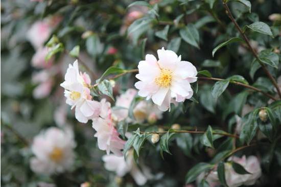 盛开的茶花姹紫嫣红,枝浓叶绿,