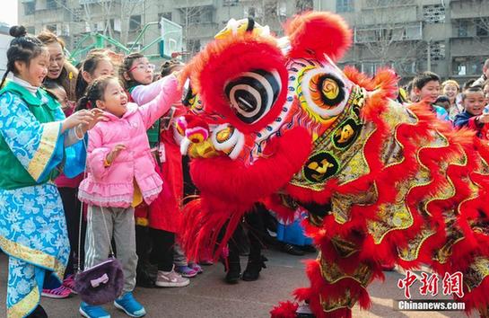 2月28日,学生们抚摸“舞狮”。当日,在济南明湖小学举办的“民俗文化节”上,学生们着古装参加活动,品味中华传统文化魅力。