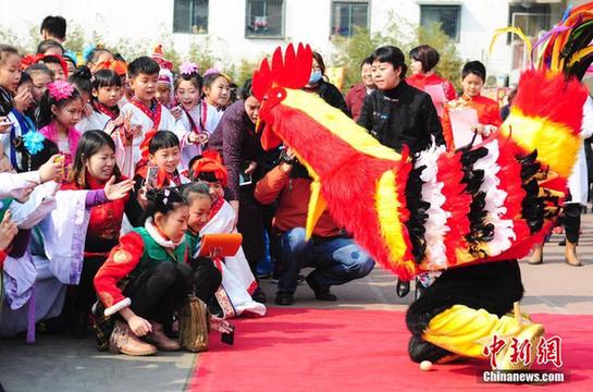 2月28日,学生们被“金鸡”下蛋吸引。在济南明湖小学举办的“民俗文化节”上,学生们着古装参加活动,品味中华传统文化魅力。