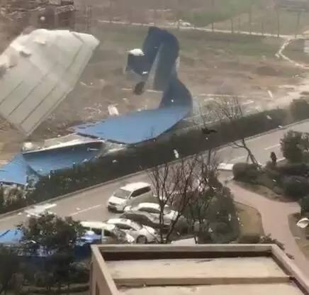 (图 网曝盐城阜宁县迎宾市场楼顶广告牌被吹下楼)