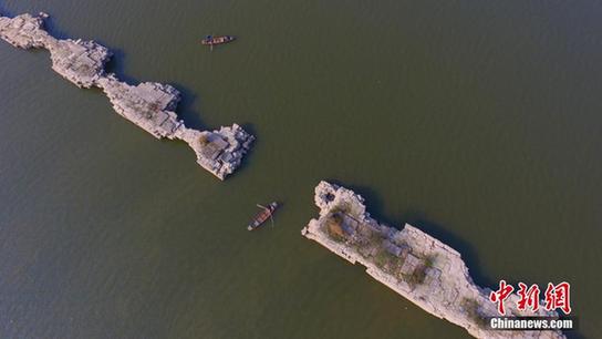 3月1日,航拍江西仙女湖明代万年桥。时下正值枯水季,江西省新余市仙女湖水位下降,水落古桥出。中新社/赵春
