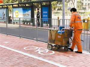 工作人员正在划定自行车停车位。深圳晚报记者 刘菲菲 摄