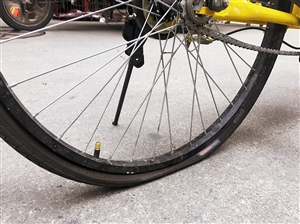 一辆轮胎扁了的小黄单车。 深圳晚报实习记者 唐文隽 摄