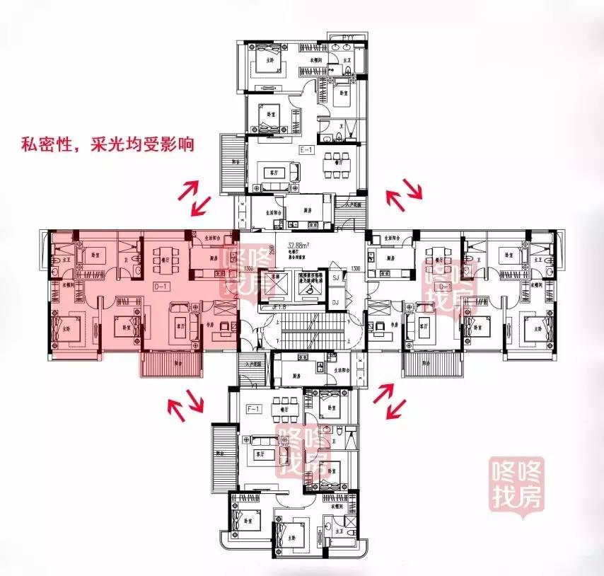 从楼间距上看,深业中城要更胜一筹,但两个项目都有部分户型采光不佳和存在私密性差的情况。
