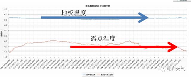 目前地板温度远高于露点温度,未来没有明显冷空气影响,地板温度不会明显下降,未来暖湿气流露点温度会上升,天气趋于潮湿,但是低于地板温度,所以 不会出现明显的回南天。