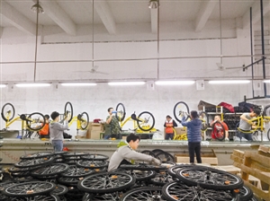 2月24日,深圳市光明新区铁塔工业园区的一间厂房里,灯火通明。深圳市麦可斯车业有限公司(以下简称“麦可斯”)的生产线正在徐徐运转。流水线上的工人忙碌地处理着共享单车的组装工序。