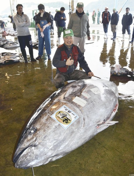 当地时间2017年3月5日,日本和歌山县,渔民展示捕获的蓝鳍金枪鱼。胜浦渔港一名渔民捕获了一条重达446千克、体长2.82米的巨型金枪鱼,打破该渔港捕获过的最大金枪鱼纪录。据报道,当地业者随后用300万日元(约合人民币18万元)的价格将其拍下,之后送往百货店等地进行销售,预计鱼肉可制作3000人份寿司。据了解,该渔港此前捕获过的最大金枪鱼为417千克,时间为2016年1月。