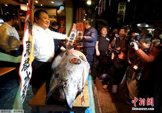 当地时间2017年1月5日,日本东京,筑地水产市场迎来了2017年的首个交易日,在开市前就有不少客人来预定这里著名的蓝鳍金枪鱼,而其中最大的一条金枪鱼被寿司连锁店“寿司三昧”的老板Kiyoshi Kimura拍得,这条重达212公斤的蓝鳍金枪鱼成交价为7400万日元(约4370000人民币)。图为“寿司三昧”老板Kiyoshi Kimura在他的门店前向顾客展示这条巨型金枪鱼。