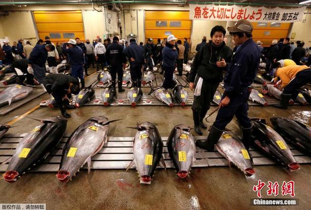 当地时间2017年1月5日,日本东京,筑地水产市场迎来了2017年的首个交易日,在开市前就有不少客人来预定这里著名的蓝鳍金枪鱼,而其中最大的一条金枪鱼被寿司连锁店“寿司三昧”的老板Kiyoshi Kimura拍得,这条重达212公斤的蓝鳍金枪鱼成交价为7400万日元(约4370000人民币)。
