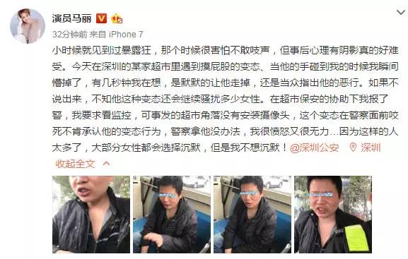 马丽在微博中写道:“今天在深圳的某家超市里遇到摸屁股的变态、当他的手碰到我的时候我瞬间懵掉了,有几秒钟我在想,是默默的让他走掉,还是当众指出他的恶行。如果不说出来,不知他这种变态还会继续骚扰多少女性。在超市保安的协助下我报了警,我要求看监控,可事发的超市角落没有安装摄像头,这个变态在警察面前咬死不肯承认他的变态行为,警察拿他没办法,我很愤怒又很无力…因为这样的人太多了,大部分女性都会选择沉默,但是我不想沉默!”
