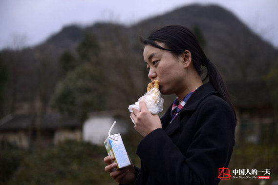 午间时分,黄俊月停止走访工作,就着牛奶烧饼吃午饭。她说这时候老乡们也在吃饭,到热情的老乡家里不吃饭会显得生分,吃的话会增加他们的负担,避开就好了。