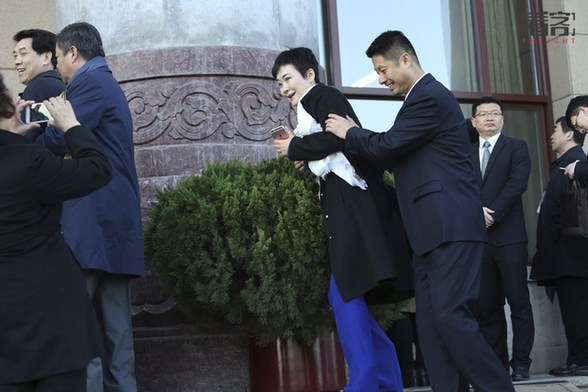 2017年3月5日,十二届全国人大五次会议在北京人民大会堂开幕。全国政协委员李小琳列席大会。步入会场时被绿植挡住去路,在旁人帮助下绕过台阶得以通过。贾亮/视觉中国