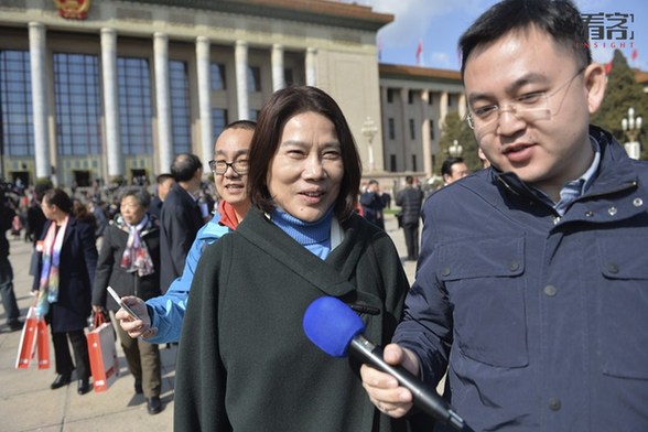 无论是在室内还是室外,他们都是新闻记者追踪的焦点。2017年3月5日,北京,十二届全国人大五次会议开幕。董明珠接受媒体采访。扬阳/视觉中国