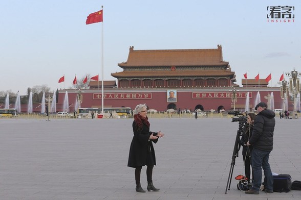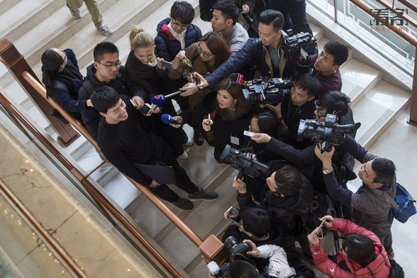 2017年3月5日,北京,十二届全国人大五次会议举行开幕会。会场外的外籍记者。视觉中国