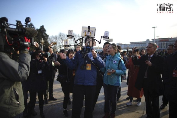 两会记者的这道风景中,新型的采访报道工具偶尔也会吸引人的注意力,但只是短暂成为焦点。2017年3月5日,北京,十二届全国人大五次会议举行开幕会。会场外的媒体记者。大萌/视觉中国