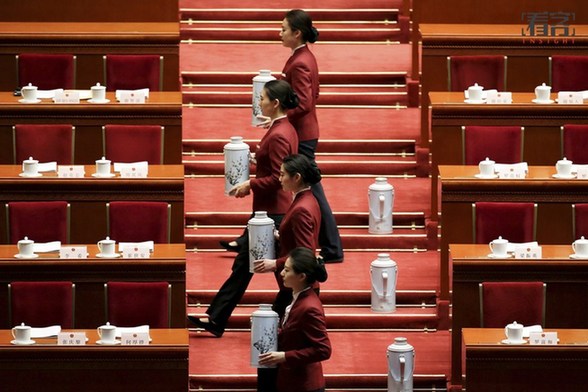 2017年3月5日,北京,十二届全国人大五次会议在人民大会堂举行开幕会,服务人员。视觉中国