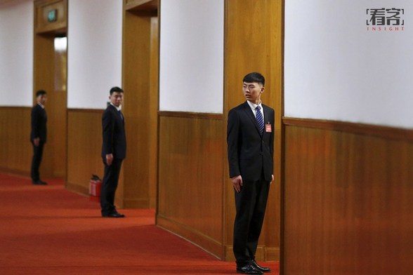 除了记者,两会中随处可见却又不引人注目的便是那过万的服务人员和60多万的安保力量。2017年3月5日,北京,安保人员站岗。视觉中国