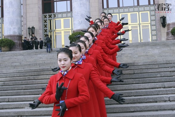 虽然这些幕后人员在两会大电影的镜头之外,但是他们却有着自己存在的意义。而现在,两会,这场由时代的代表组成的会议,正在进行中。2017年3月3日下午3时,全国政协十二届五次会议在北京人民大会堂开幕。两会服务员拍合影。张秀科/视觉中国