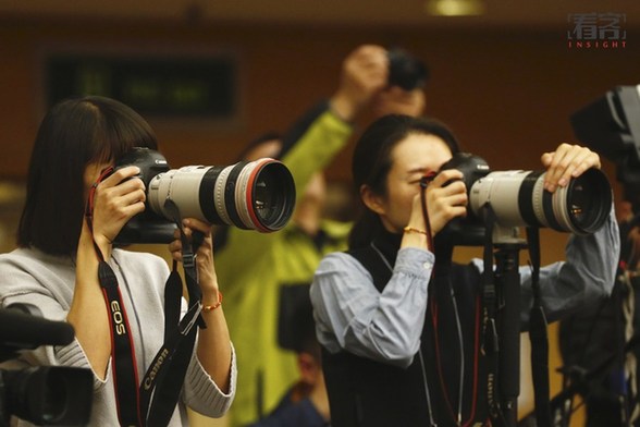 他们像是两会“大电影”的幕后工作者,位于镜头之外,两会不是他们的主舞台,但他们却共同构筑了两会。2017年3月6日,北京,十二届全国人大五次会议新闻中心于10时在梅地亚中心多功能厅举行记者会。拍照的摄影记者。视觉中国
