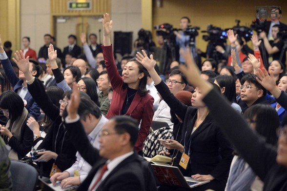 2017年3月6日,北京,十二届全国人大五次会议新闻中心邀请国家发改委主任何立峰、副主任张勇、副主任宁吉喆就“经济社会发展与宏观调控”的相关问题回答中外记者的提问。图为提问的记者们。