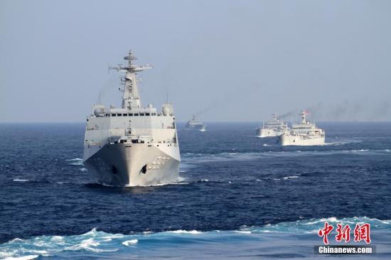 资料图:2月中旬,南海舰队某登陆舰支队组织春节过后首次编队出海训练。图为队形变换。 中新社记者 顾亚根 摄
