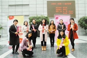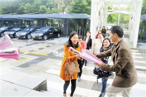 “在节日里收到这么漂亮的鲜花,真的很开心,这一天心情都会美美哒!”杨小姐从工作人员手里接过鲜花和小卡片,笑眯眯地喊着同事给自己拍照片,“一定要发朋友圈”。