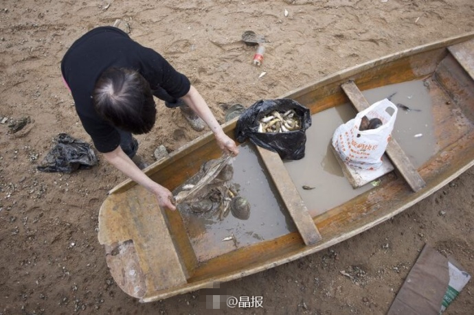 中午记者在现场看到,昔日的一池碧水现已不再,湖底大部分都已裸露出来。几十人,有的挽着裤脚,有的索性就穿着短裤,提着网兜,站在最深处齐大腿的水里摸鱼。不少人已经“收获颇丰”,提着满麻袋的鱼和蚌类上岸向围观人群售卖。
