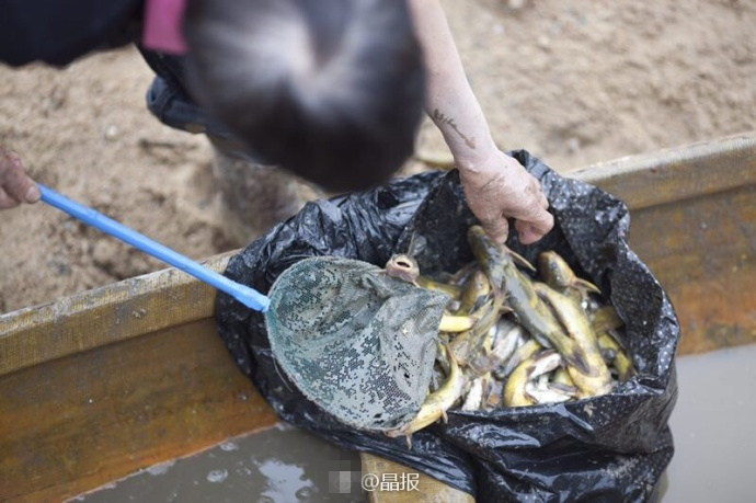 深圳市中心公园换水露湖底 众人混水摸鱼