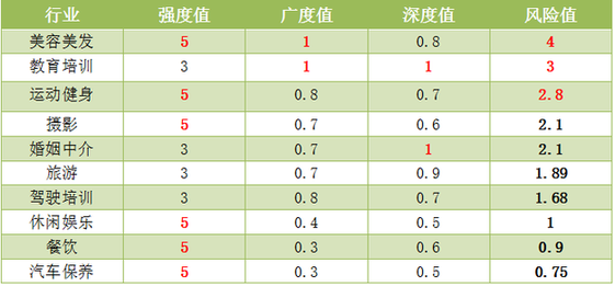 预付式消费领域问题突出,消费风险极高。面对消费者生活中常遇见被“卡”住的消费纠纷,我会以2016年消费投诉数据为基础,从预付式消费风险的强度(侵权行为对消费者权益侵害的力度)、广度(预付式消费使用的规模和侵权发生的频率)及深度(预付式消费涉案金额)三个维度对美容美发、运动健身、驾驶培训、婚姻中介、休闲娱乐、摄影、旅游、汽车美容、餐饮10个行业进行预付式消费风险评估。三者是相互强化促进关系,我会以三个维度的乘积为评估标准,得出行业风险水平值的计算公式:风险水平值=行业的风险强度*行业风险广度*行业的风险深度,计算出各个行业的风险值。