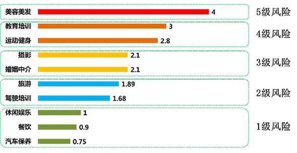 依据风险值水平,我会对各行业进行风险等级评估。美容美发行业位居风险等级首位,为最具风险的预付式消费领域。该行业广泛使用预付式消费,消费群体多,消费金额大,服务质量差、办卡容易退卡难、变更经营者、关门跑路等问题突出。